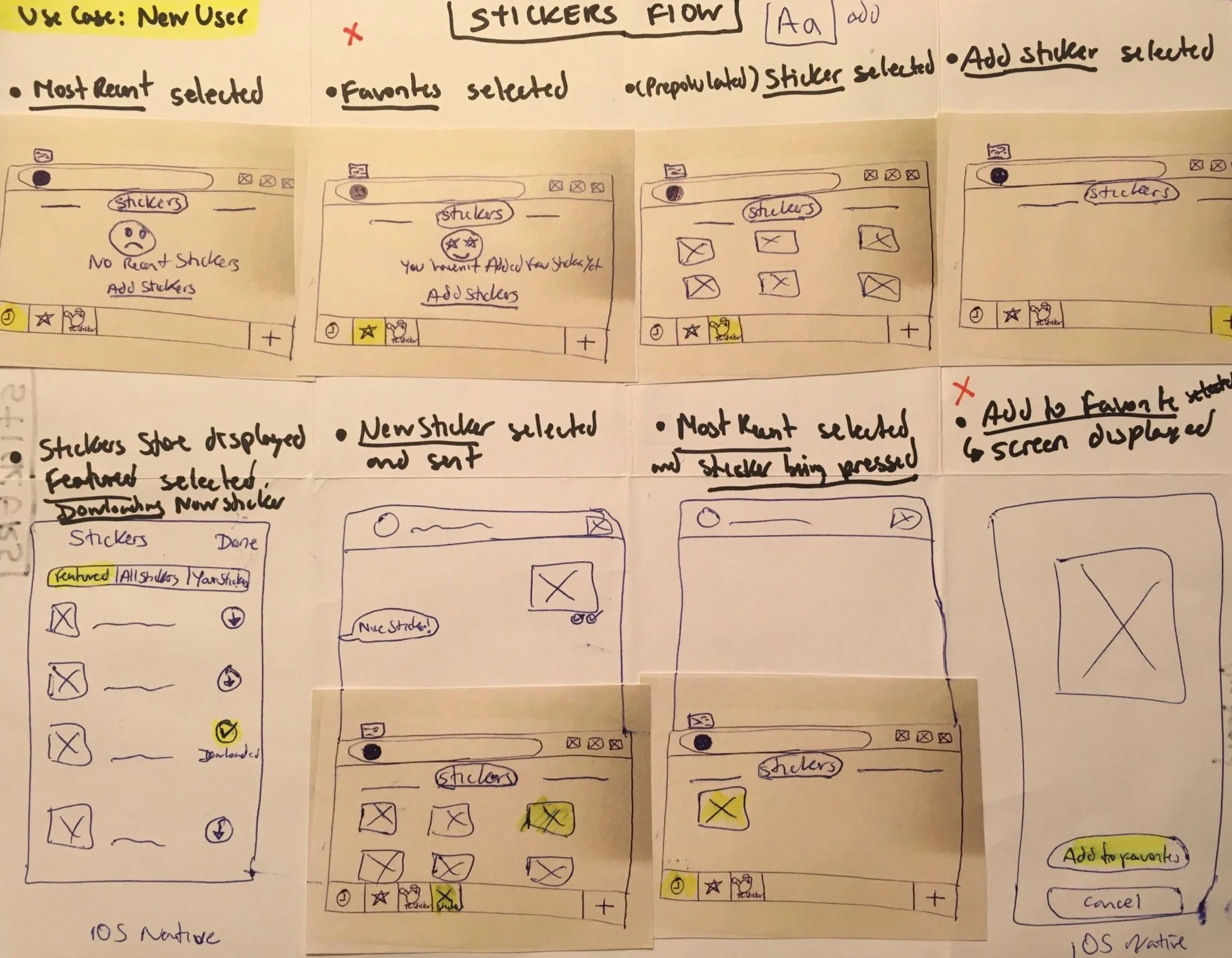 Second, we focused on the stickers flow and the content that needed to be added for certain screens, as shown below. On previously empty areas with no content, we included Add Stickers link to promote using the feature.