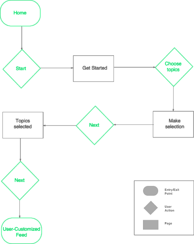 This was the previous on-boarding, indicating the flow step by step. At the very beginning, the user was prompted to get started right away. Then, different topics were spread out in the second screen. No indication other than choose topics is displayed here. If the user does not choose at least 5 topics, they cannot move onto the next screen. Once topics are selected, the custom feed is created. There are no other indicators or guides other than the ones shown in the map below: