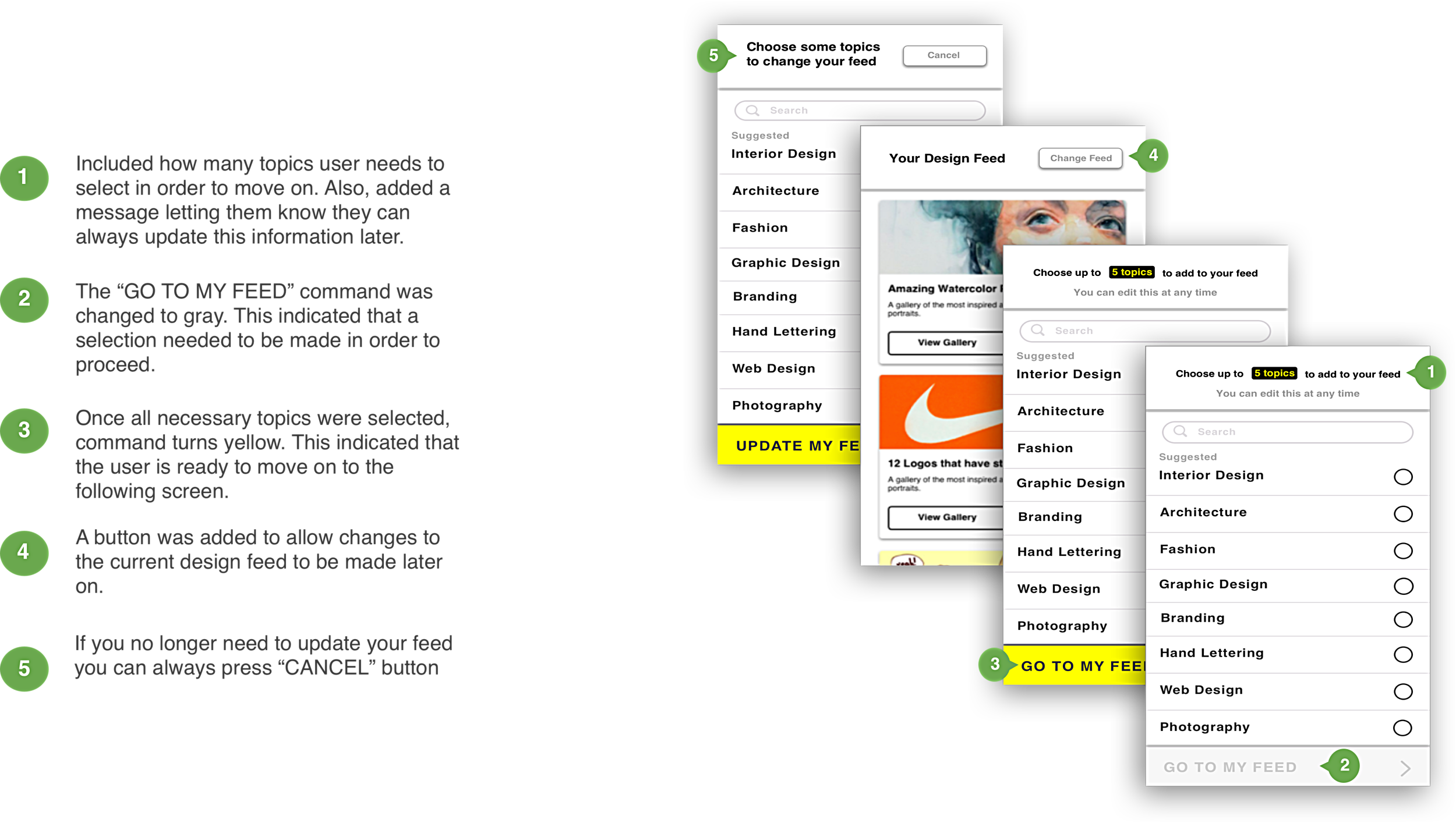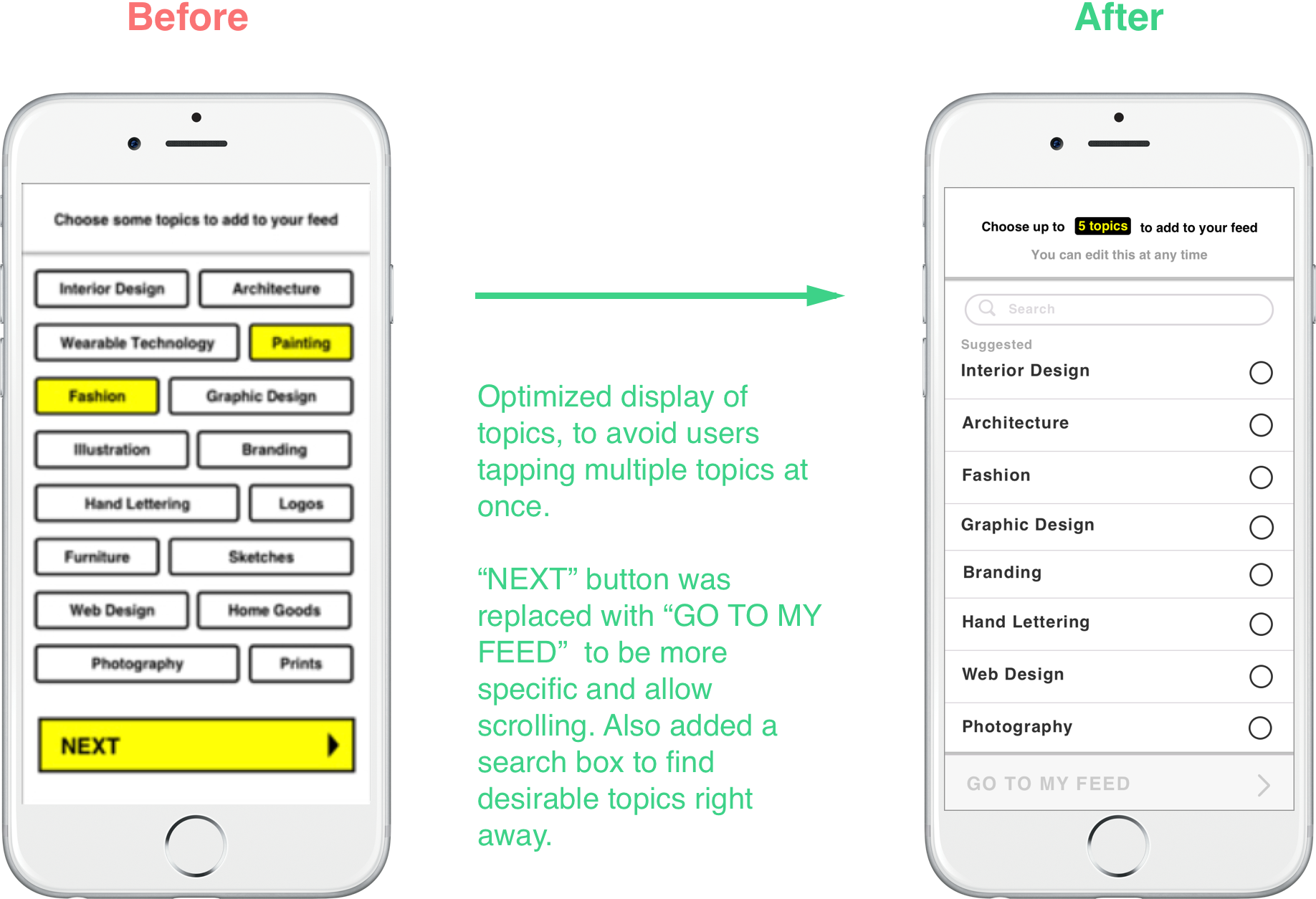 DesignFeed is a mobile app, which allows you to create a custom feed based on things that inspire you. User testing revealed there was room for improving this app's usability and design optimization. My role was to collect and analyze data from user testing and redesign the on-boarding experience.
